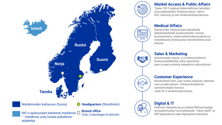- Kaupallinen toteutus: Vauhditamme kasvua lokalisoinnilla, asiantuntevilla käännöksillä ja alueellisella markkinoinnilla. Laaja verkostomme kattaa terveydenhuollon ammattilaiset ja sairaalat kaikissa Pohjoismaissa.