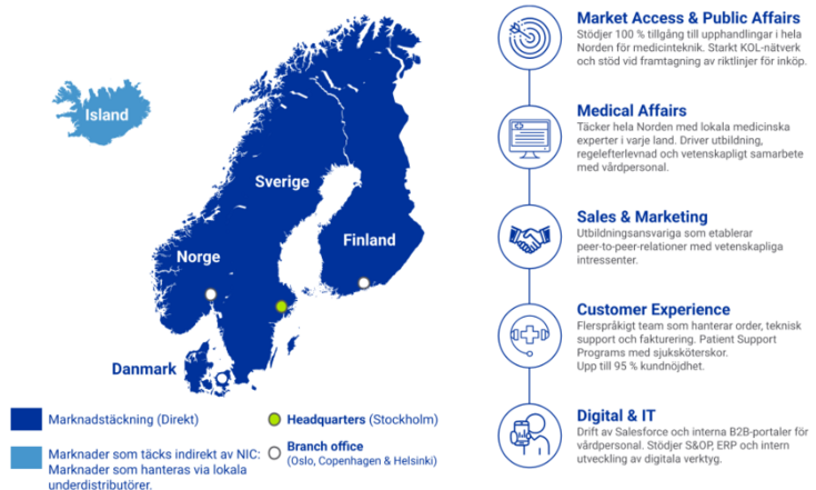 Vi är den hängivna länken mellan innovativa globala hälso- och sjukvårdslösningar och den unika nordiska marknaden. Vi specialiserar oss på att leverera avancerade läkemedels- och medicintekniska behandlingar – främst fokuserat på hembaserad vård såsom inhalation, intravenös- eller subkutan infusion för i huvudsak kroniska sjukdomar i Sverige, Finland, Danmark, Norge och Island.